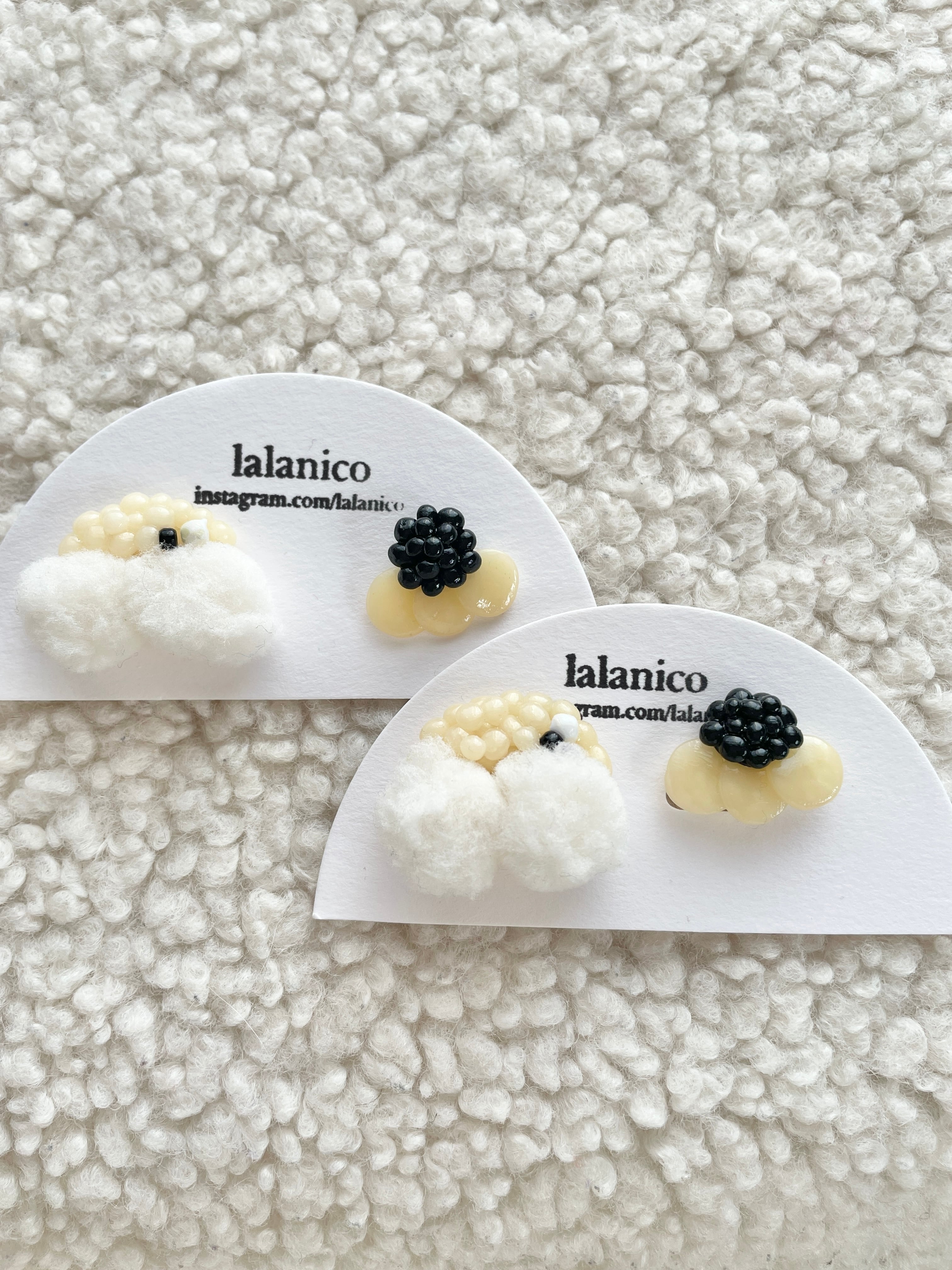 白いふわふわが存在感のある耳飾りです。黒を使って可愛らしすぎないデザインに。