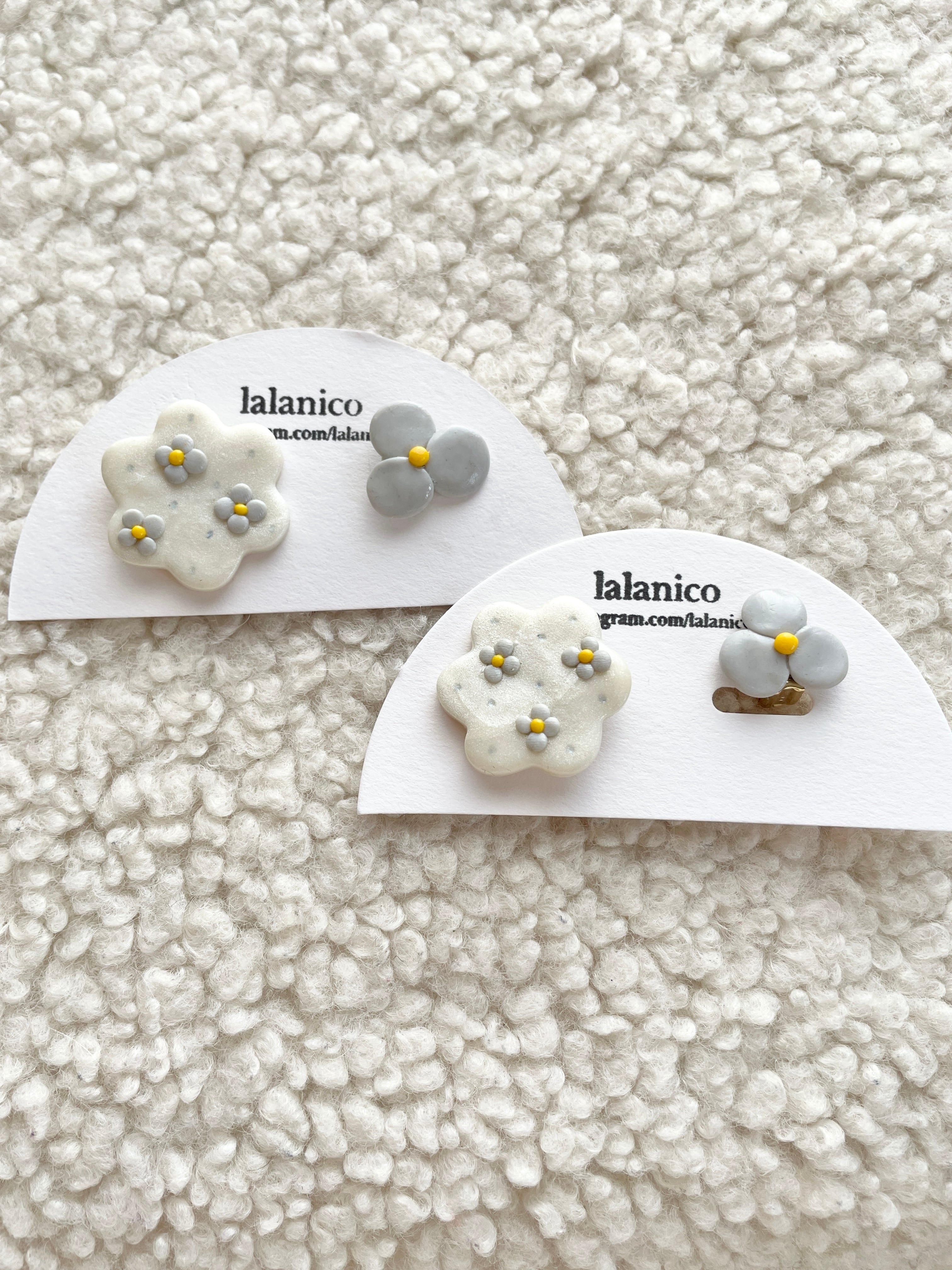 大小のお花モチーフのアシンメトリーなデザイン。合わせやすいカラーの耳飾りです。