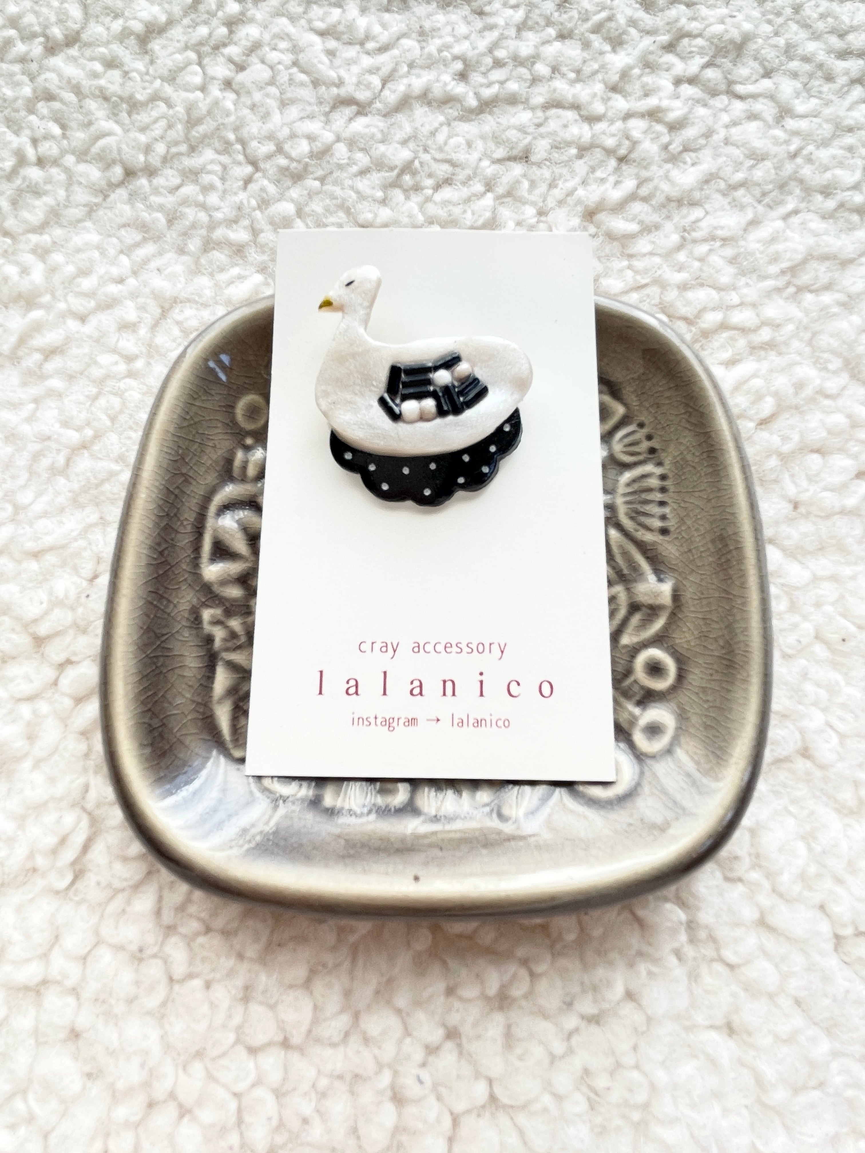 定番のスワンブローチにビーズなどを使っておめかしさせました。パールクレイと黒の組み合わせが上品です。