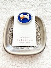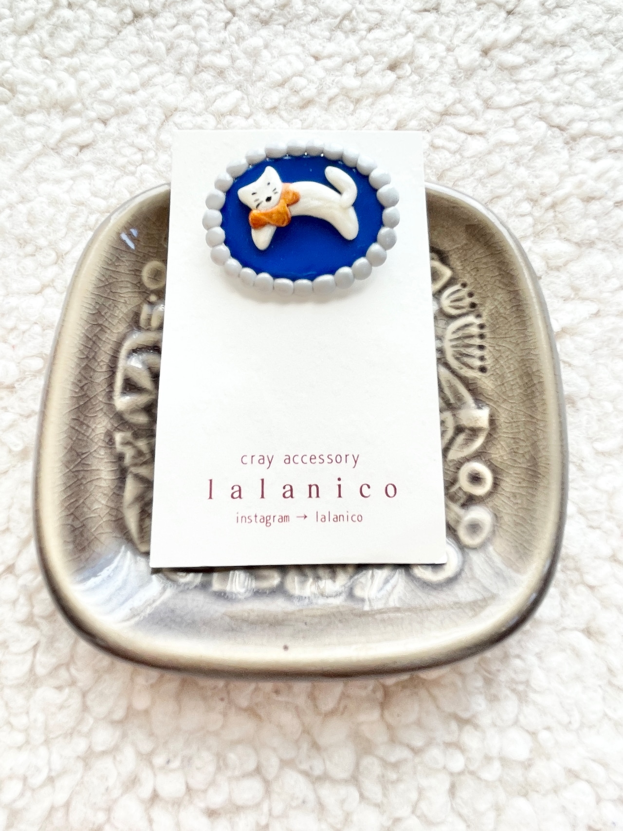 パキッとしたブルーに白いネコが映える楕円型のブローチ。お洋服の差し色になってオシャレ度アップです!