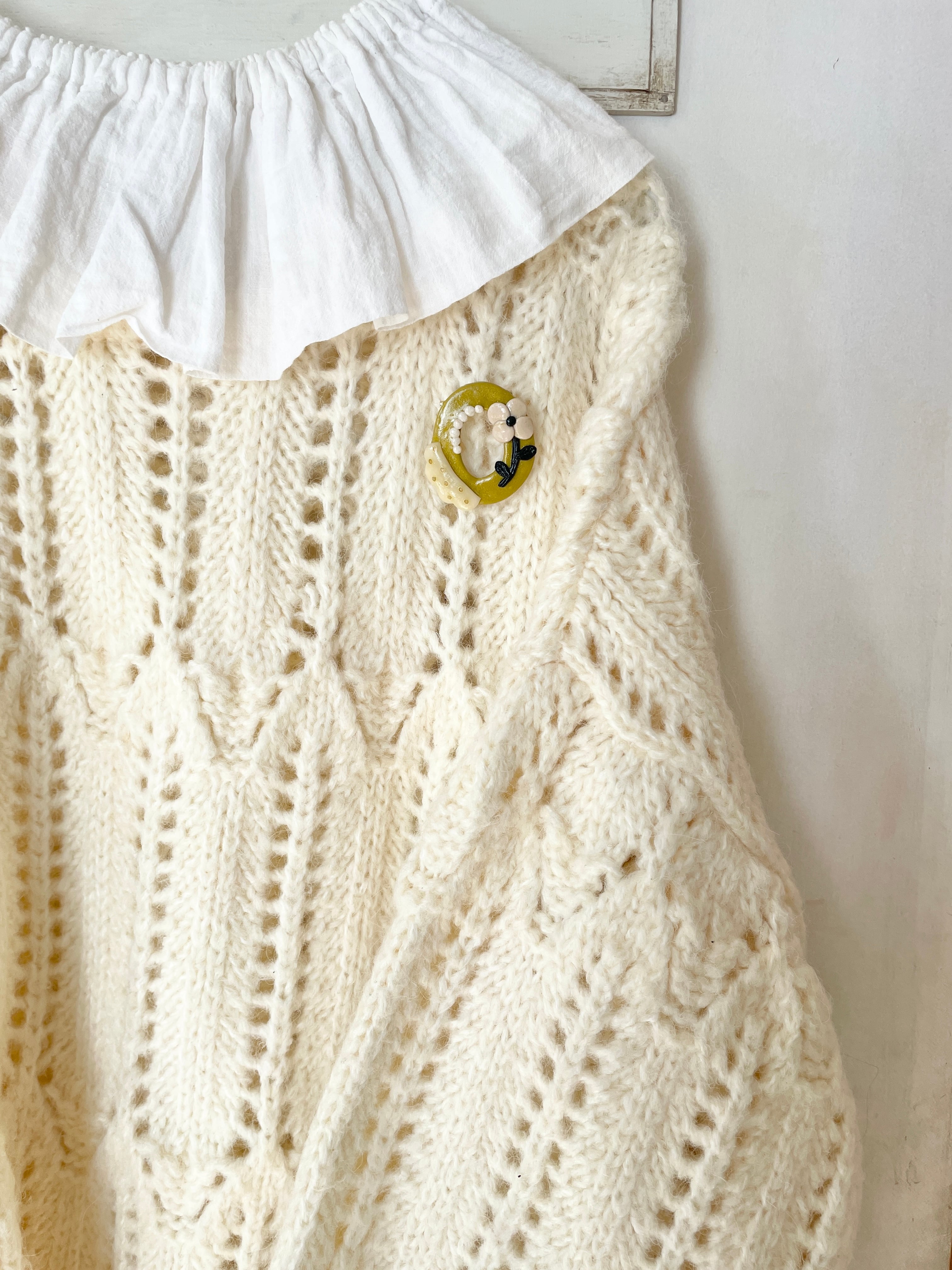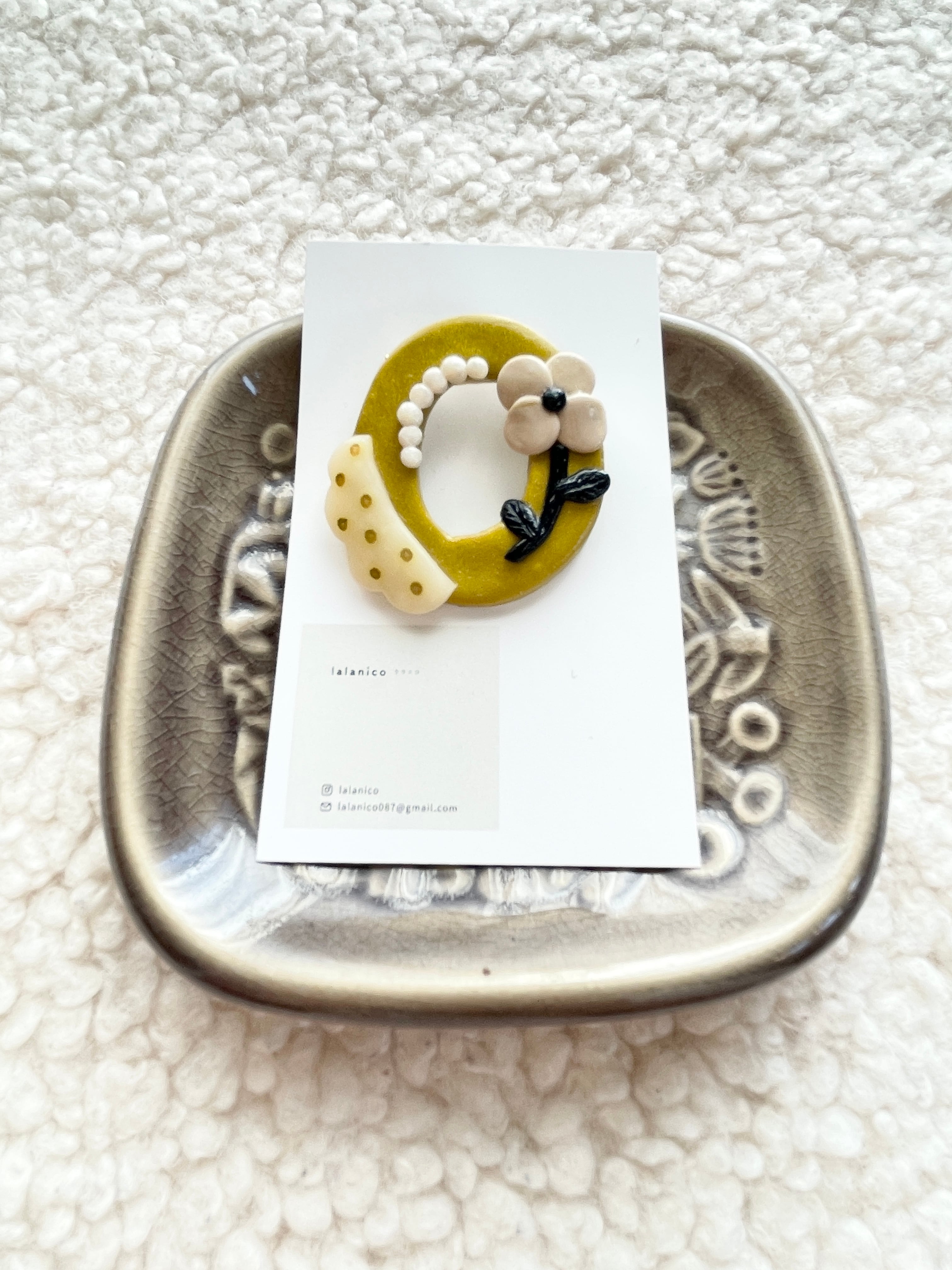 何色かのクレイを混ぜて作ったからし色をベースにお花やつぶつぶなどのモチーフを合わせた個性的でおしゃれなブローチです。