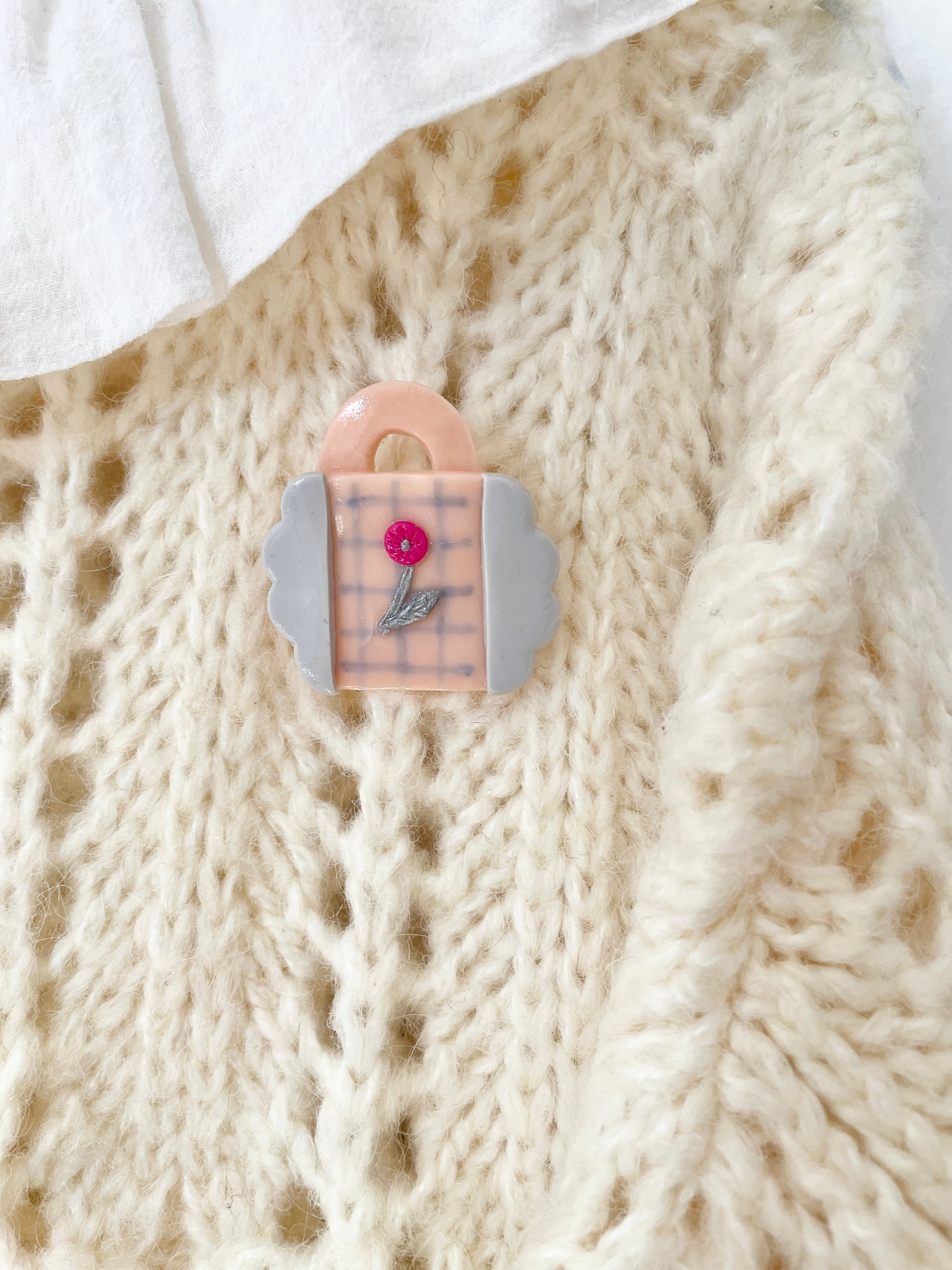 サイドにフリルがついたトートバッグのブローチです。個性的で色合いも可愛い♡オススメです!