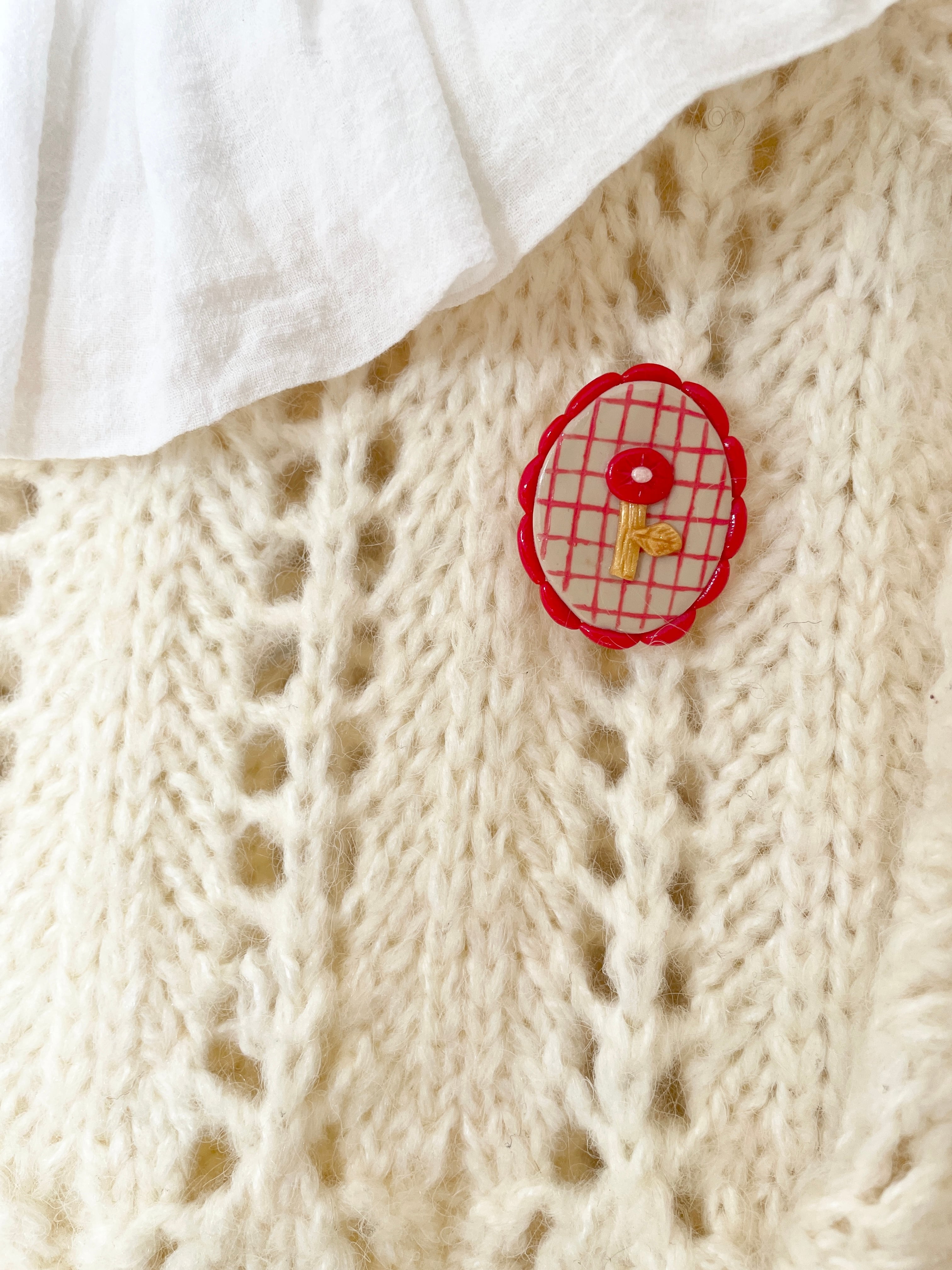 赤いお花の楕円ブローチ